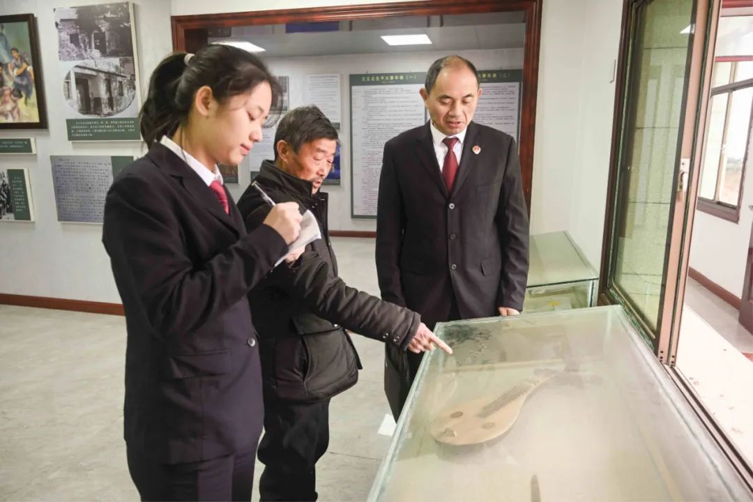 (故居管理人员向检察官介绍整改后馆内的陈列品——土琵琶)