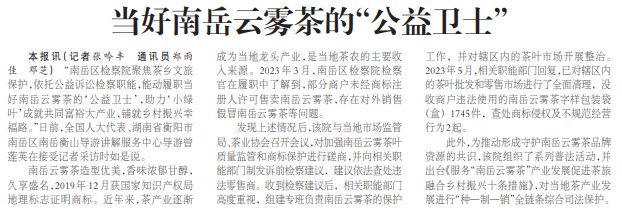 南岳云雾茶造型优美,香味浓郁甘醇,久享盛名,2019年12月获国家知识产权局地理标志证明商标。近年来,茶产业逐渐成为当地龙头产业,是当地茶农的主要收入来源。2023年3月,南岳区检察院检察官在履职中了解到,部分商户未经商标注册人许可售卖南岳云雾茶,存在对外销售假冒南岳云雾茶等问题。