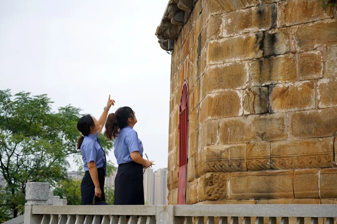 ▲承办检察官在查看凌云塔塔身情况。